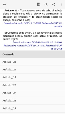 Para visualizar el Índice de Artículos de las leyes en su dispositivo móvil, abra el archivo PDF de una ley con Adobe Acrobat Reader y en el menú superior indicado con tres puntos verticales, seleccione la opción "Contenido" (o la opción "Marcadores" según su versión de Adobe Acrobat Reader) para mostrar el Índice de Artículos desplegable.