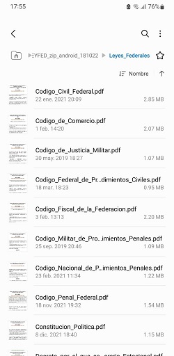 Utilice la aplicación Mis Archivos de su dispositivo móvil para explorar la carpeta "Leyes_Federales" que contiene las 313 leyes federales vigentes en formato PDF optimizadas para vista en dispositivo móvil (celular y tablet).