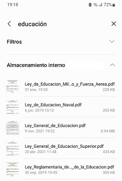 Dado que los títulos de las leyes con denominaciones largas se muestran compactados, utilice la opción "Buscar" (ícono de Lupa) en la aplicación Mis Archivos para localizar leyes por palabra clave, en la carpeta "Leyes_Federales".
