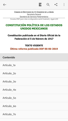 Para visualizar el Índice de Artículos de las leyes en su dispositivo móvil, abra el archivo PDF de una ley con Adobe Acrobat Reader y en el menú superior indicado con tres puntos verticales, seleccione la opción "Contenido" (o la opción "Marcadores" según su versión de Adobe Acrobat Reader) para mostrar el Índice de Artículos desplegable.