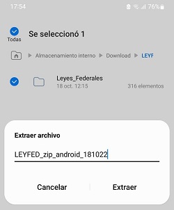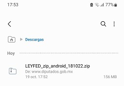 Utilizando la aplicación Mis Archivos de su dispositivo móvil, o la aplicación RAR para Android, descomprima el archivo descargado LEYFED_zip_android_091025.zip, que encontrará en la ubicación Descargas de su dispositivo.